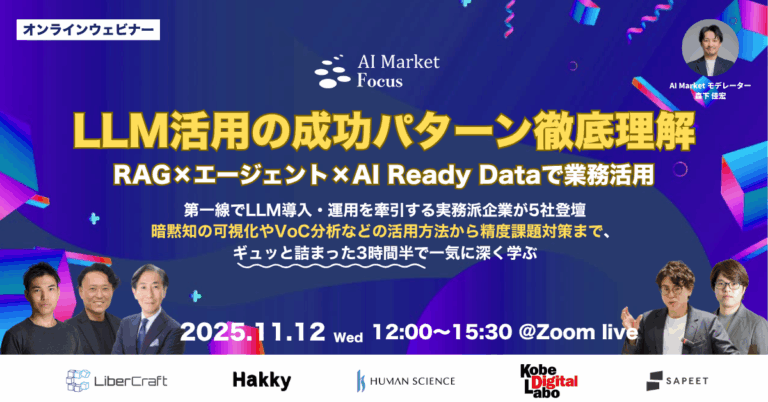 生成AIのビジネス活用が広がる今、「LLM(大規模言語モデル)を自社でどう使えばいいのか」「具体的に何から始めればいいのか」と悩む企業も多くなっています。 そこで本ウェビナーでは、RAG(検索拡張生成)・エージェント・AI Ready Dataなどの、LLM活用を成功に導く要素に焦点を当て、第一線でLLM導入・運用を牽引している実務派企業5社が登壇し、それぞれの導入・改善・運用のリアルをわかりやす […]