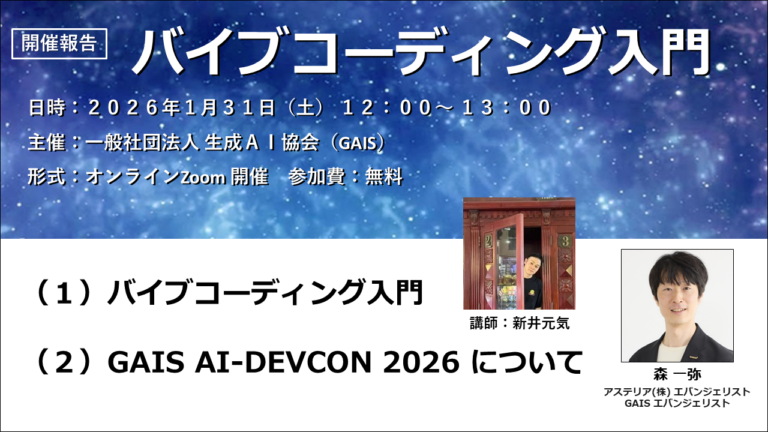 GAIS主催オンライン・セミナーのお知らせです。 いま話題のバイブコーディングについて、新井元気さんに入門セミナーを行っていただきます。誰でも参加できます。また、応募締め切りが延期された「GAIS AI-DEVCON 2026」について、現在の状況と応募について、GAISエバンジェリストの森一弥さんに語ったいただきます。 ■ GAIS主催「バイブコーディング入門」 日時:2026年1月31日(土) […]