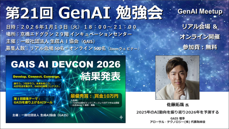 第21回の「GenAI 勉強会」をリアル会場とネット配信のハイブリッドで開催します。 参加希望の方は、下記のフォームに必要事項を入力してください。 ■ 第21回 GenAI 勉強会日時:2026年1月13日(火) 18:00~ 21:00主催:一般社団法人 生成AI協会(GAIS)場所:京橋エドグラン 29階 インキュベーションセンター募集人数:リアル 50名+ オンライン 500名(Zoomウェ […]