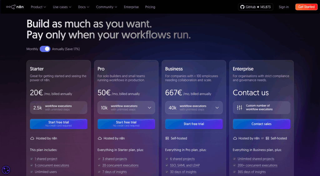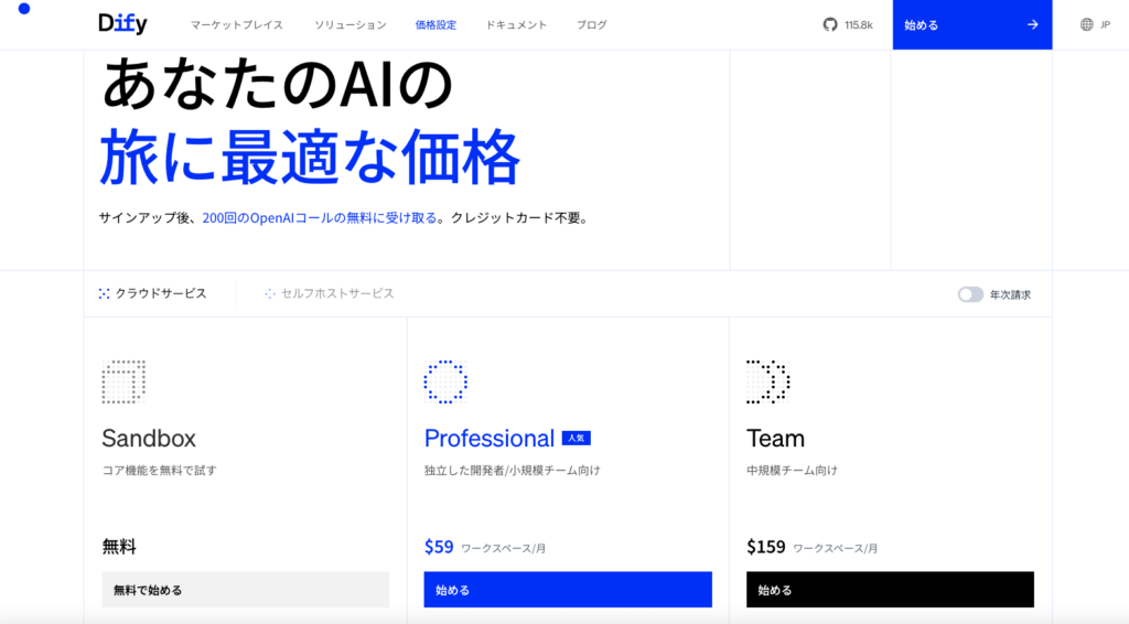 「Dify」でもクラウドの利用と、自前で環境構築する方法が選べますが、n8nでも同様に選択することができます。クラウド利用であれば、環境構築することなく、アカウントを取得すればすぐにでも利用することが可能です。環境のバージョンアップも気にする必要がないので、最新版をまずは試してみたいというレベルであればクラウドを利用するのも良いでしょう。執筆時点では「n8n」のクラウド版は無料のコースはないものの14日間の無料トライアルが可能です。対して「Dify」では機能は限定されるものの無料で使い続けるプランも存在しています。