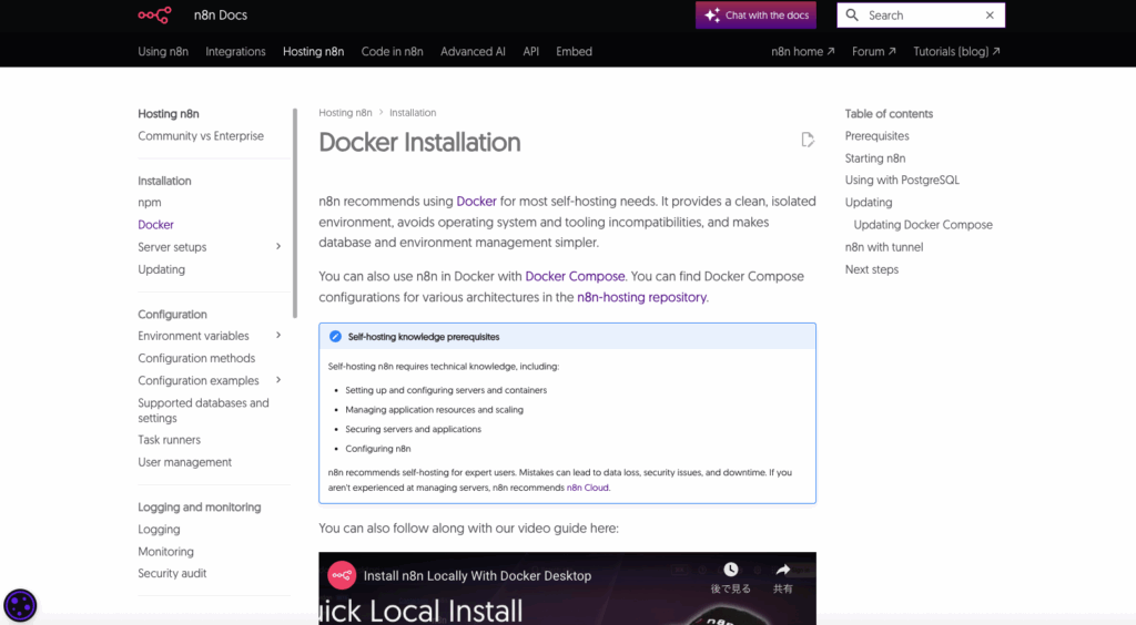 業務利用をお考えの方であれば、データの流出をできるだけ抑えたい、もしくは機能制限無く使いたいと自社環境の方で検討される方も多いのではないでしょうか?「Dify」ではDockerで構築、ソースからデプロイで構築などが選択できましたが、「n8n」でも複数の方法で環境構築が可能です。公式ドキュメントにDockerでの構築方法が掲載されているので、こちらを参考にすれば構築できるはずです。自分だけで使う、もしくは数人であればDocker Desktopを使って構築するのが一番簡単でしょう。独自ドメインを使って自社用に構築をお考えであれば、Docker Composeでの構築が合っていそうです。その他、AWSやAzure等のプライベートクラウド環境での構築方法も掲載されていましたので、ご参考に。