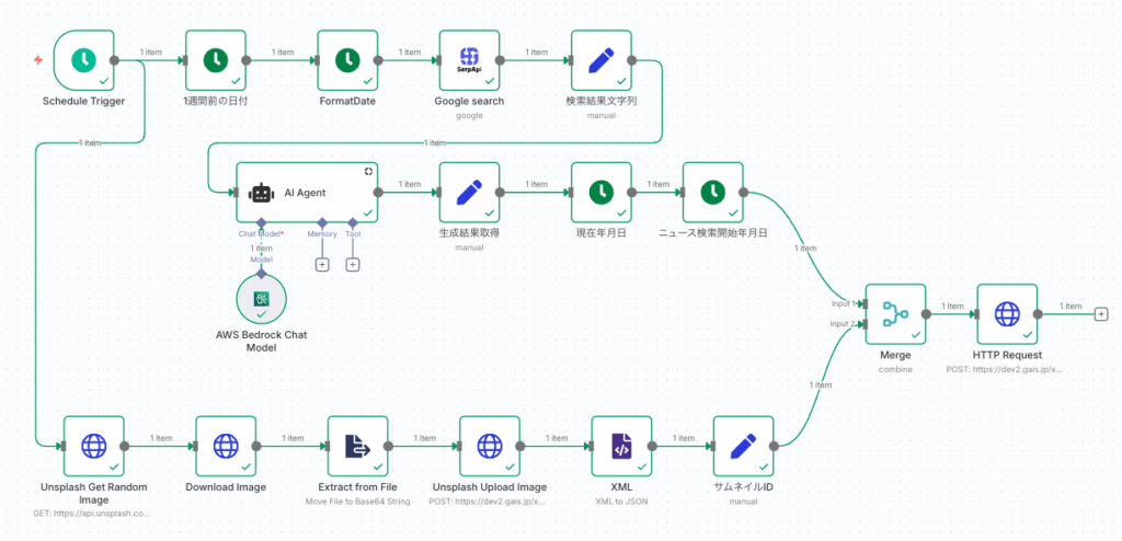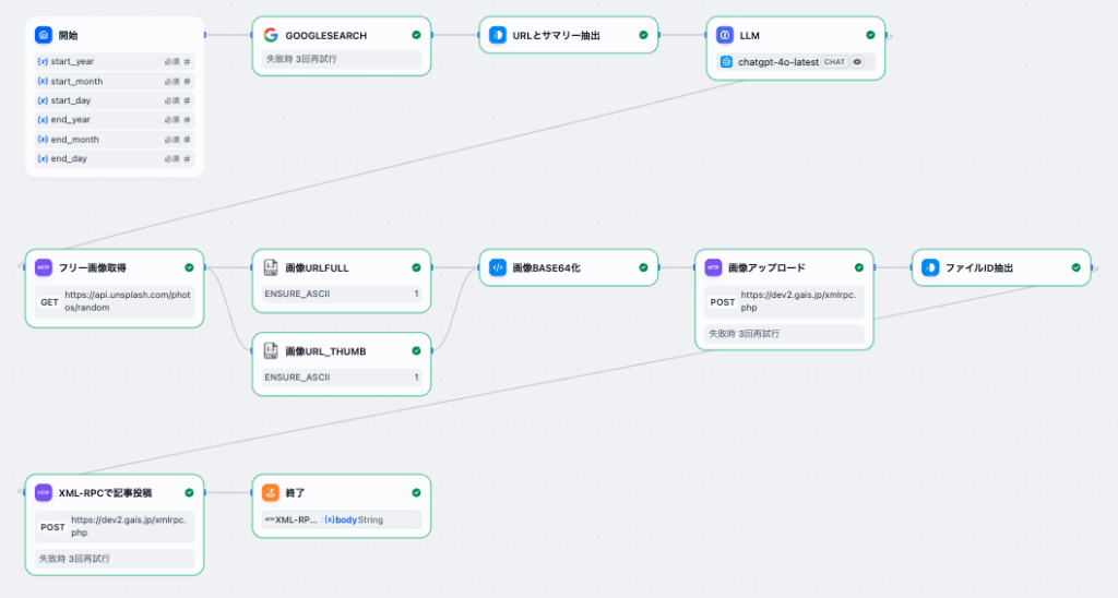 実際動いている「Dify」のワークフローは上記のものです。Google検索して記事をLLMでまとめ、記事用のフリー画像を取得し、投稿するという流れになっています。