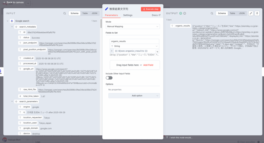 左の検索結果のツリー構造から必要な部分を抜き出し出力しています。必要箇所を中央の設定にドラッグして設定することが可能ですが、ちょっとした加工をしたければ「{{ $json.~~~ }}」部分を弄る必要があるので、普段コードを一切見ていない人には抵抗あるかもしれません。わかっている人ならさらっとやりたいことがかけるメリットにもなりますけどね。