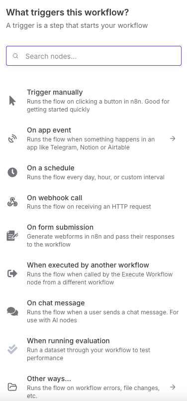 もちろん「n8n」のほうが良かった点もあります。それがトリガーが普通に使えるところ。今回使いたかったスケジュール実行も当然可能ですし、Webhookとして動かすことや、チャットからの起動も可能です。多くのサービスにも対応しておりSlackやBOXなどのトリガーもあります。