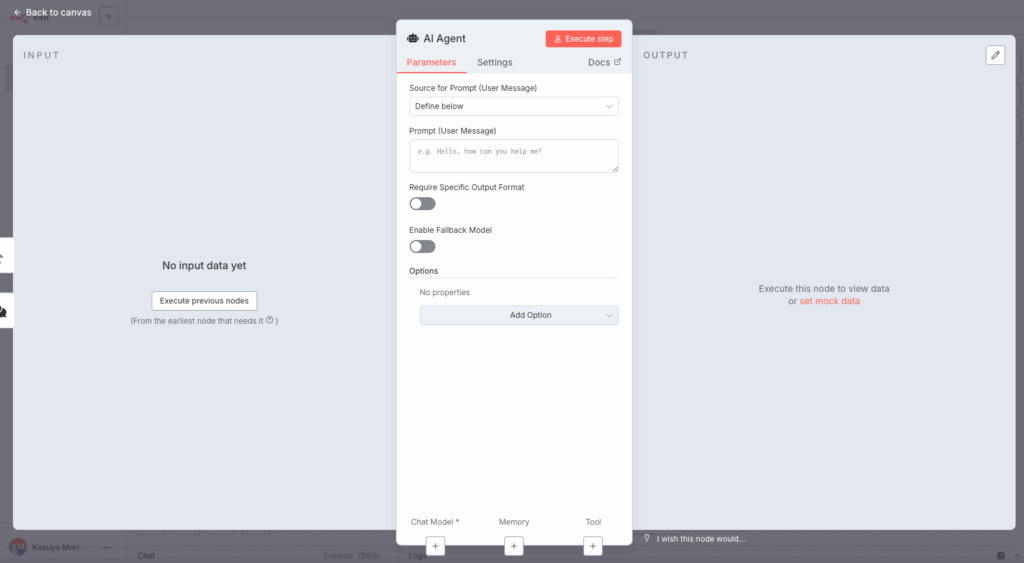 プロンプトを入れる部分があるのは想像つくでしょうが、下の方に「Chat Model」「Memory」「Tool」の3つの設定が可能になっています。