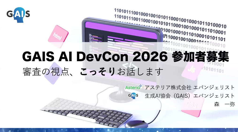 GAISエバンジェリストの森一弥さん(アステリア株式会社/GAISエバンジェリスト)が、「GAIS AI-DEVCON 2026」応募の最新状況(締切延期)と、応募で“得する”ポイント(審査の観点)を共有しました。当初は1月上旬締切だったところ、応募期間は2月まで(=2月末まで)に延長。森さんは「1か月あるので、ぜひ参加を」と強く呼びかけました。