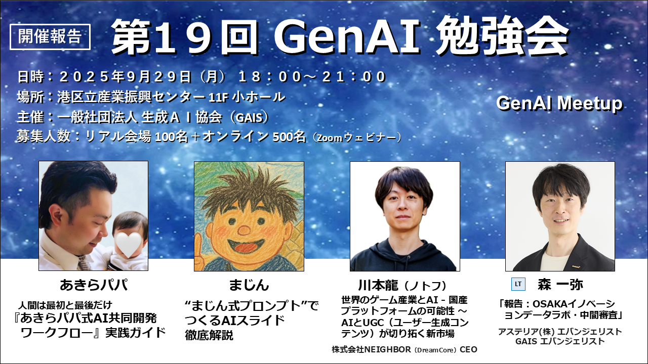 ![]() | ■第19回 GenAI 勉強会 動画アーカイブ (1)あきらパパ 氏「人間は最初と最後だけ|AIと共創する次世代開発手法『あきらパパ式AI共同開発ワークフロー』実践ガイド」 (2)川本龍(ノトフ) 氏「世界のゲーム産業とAI – 国産プラットフォームの可能性 ~ AIとUGC(ユーザー生成コンテンツ)が切り拓く新市場」 (3)まじん 氏「実務で使える!“まじん式プロンプト”でつくるAIスライド徹底解説」 (4)ライトニング・トーク (A)森一弥 氏「報告:OSAKAイノベーションデータラボ・中間審査」 (B)上田 達大 氏「GitコマンドとCopilotでつくる!AIテスト仕様書生成術」 (C)花坂弘之 氏「活動報告:建築・土木WG」 |