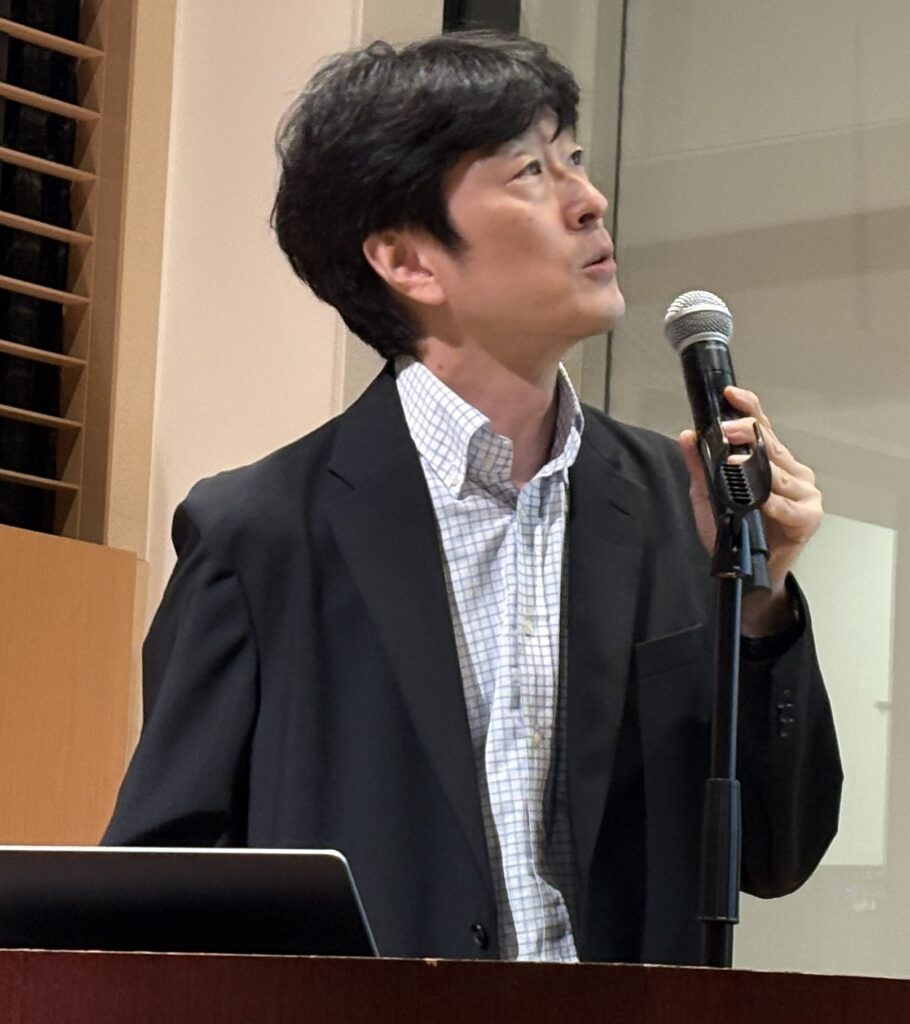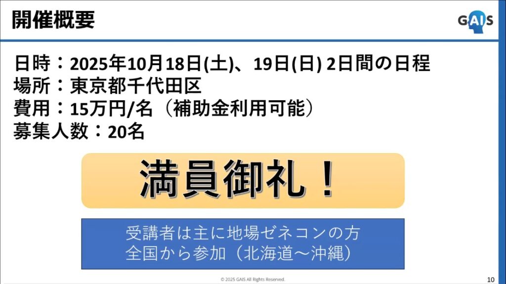 ライトニングトークの最後は、日本マルチメディア・イクイップメント株式会社の花坂弘之氏が「活動報告:建築・土木WG」と題して登壇しました。花坂氏は、老朽化するインフラや人材不足、増加する災害対応など課題が山積する建設業において、生産性向上に生成AIをどう活用できるかをテーマに活動していると紹介。これまでに上村代表理事やシビルクリエイト社長の川西氏、AIテックの河津氏(GAIS理事)らを迎えて勉強会を実施し、現場の声を収集してきたと報告しました。その中では「生成AIをどう使ってよいか分からない」「建設実務に直結した内容が少ない」といった意見が多く寄せられたといいます。そこでWGでは、施工計画書の爆速作成を題材にした「建設技術者のための生成AI実践セミナー」を企画。実際の現役建設技術者が講師となり、ChatGPTやNotebookLM、ナプキンAIなど複数のツールを駆使する実践的なプログラムを用意しました。10月開催分は既に満員御礼となり、全国のゼネコンから熱い関心が寄せられたとのことです。さらに12月には九州での追加開催、来年2月には東京での開催も決定しており、今後の展開に大きな期待が集まる発表となりました。