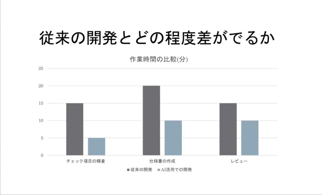 あきらパパさんの講演では、従来はエンジニアが全工程を担い長時間労働となりがちなところ、本手法では人間が担うのは「要件定義」と「最終確認」の2工程のみ。その他11工程をAIが自動で実行し、作業時間を1/4に短縮。ToDoアプリの開発例をもとに仕様書作成からコードレビュー、修正、ドキュメント生成までAIが担う流れをデモンストレーション。導入効果として開発速度3倍、バグ70%減という成果が示されました。小規模な関数開発から試せる実践的なガイドに、多くの参加者が刺激を受けたセミナーとなりました。