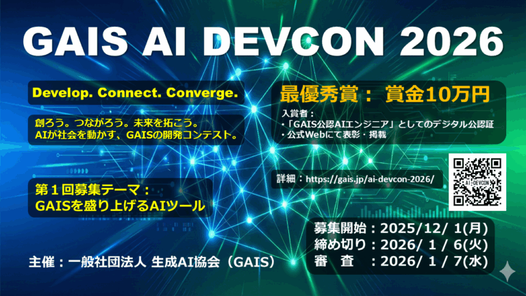 Develop. Connect. Converge.創ろう。つながろう。未来を拓こう。AIが社会を動かす、GAISの開発コンテスト。 一般社団法人 生成AI協会(GAIS)は、生成AIの社会実装と普及を推進するため、全国の開発者・AI活用者・研究者・自治体・企業の皆さまに向けて、第1回 GAIS AI DEVCON 2026 を開催します。 本コンテストでは、「GAISを盛り上げるAIツール」を […]